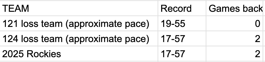 While these are still intriguing questions, I will post hypothetical standings featuring a team on pace to lose 121 games (a .253 winning percentage), a team on pace to lose 124 games (a .235 winning percentage) and the 2025 Rockies. As of Thursday morning: