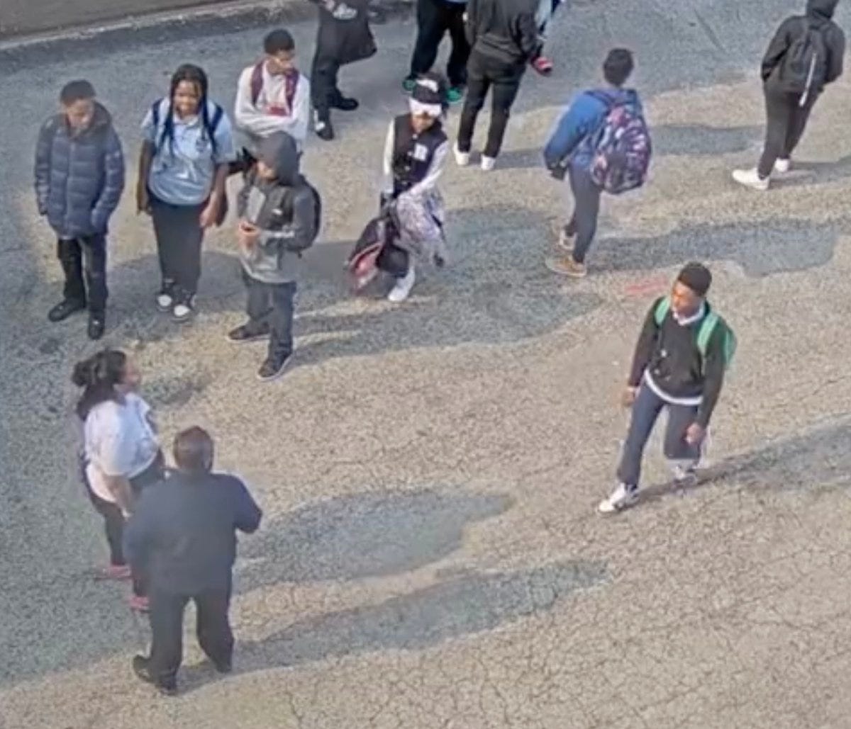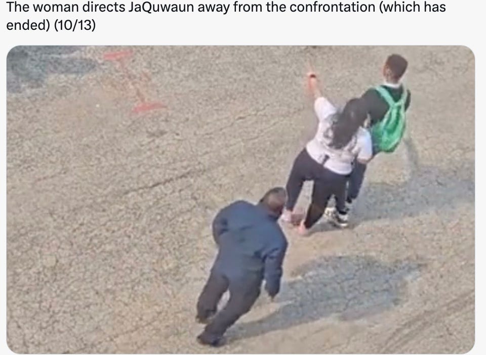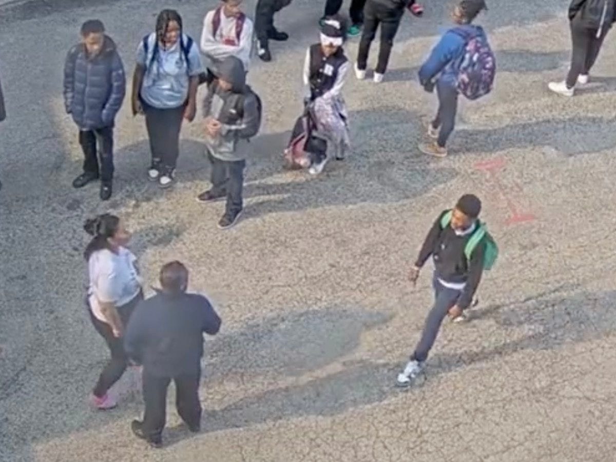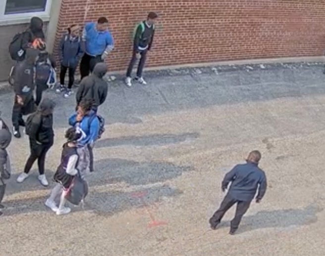 I looked at it moment by moment in a recent Twitter thread, starting with this image in which you see JaQuwaun, wearing a green backpack, approaching Lancaster, in the dark blue, who was at the school visiting math teacher Yana Cruz. Take note of the girl in the light blue shirt, top left.