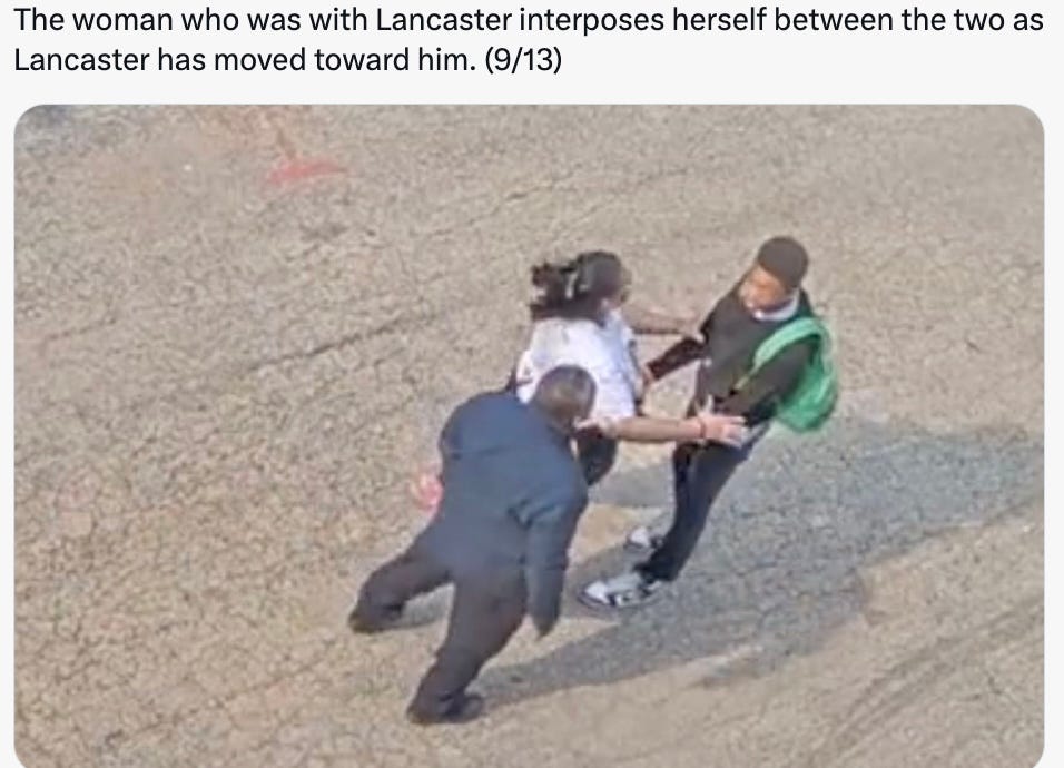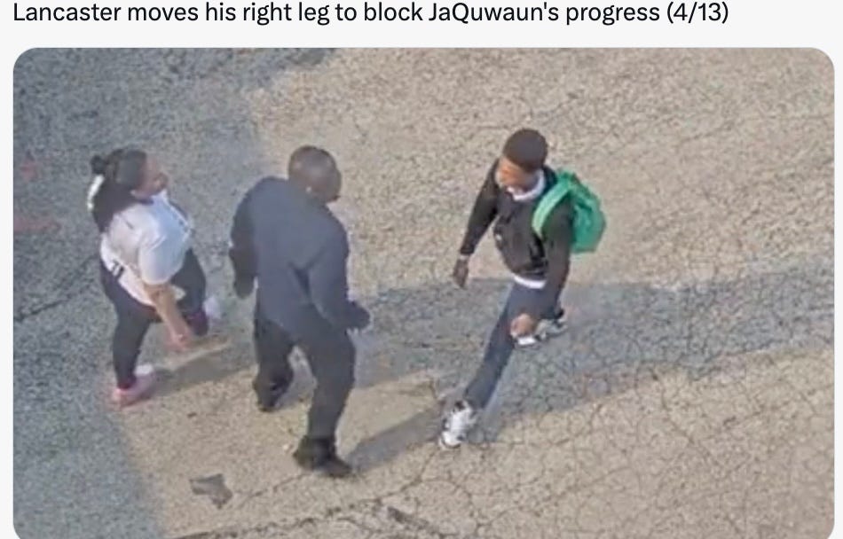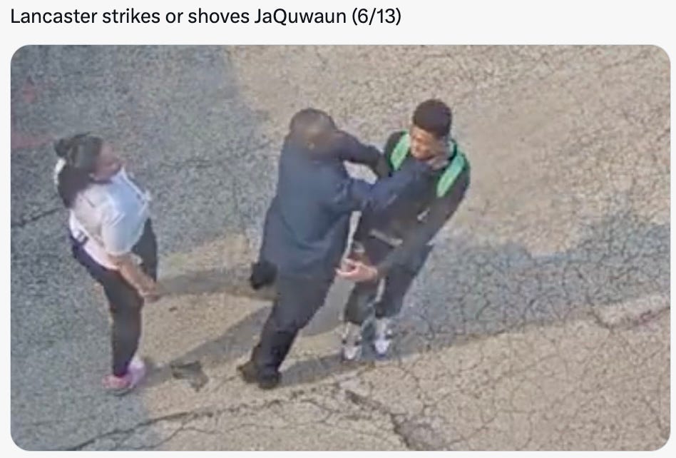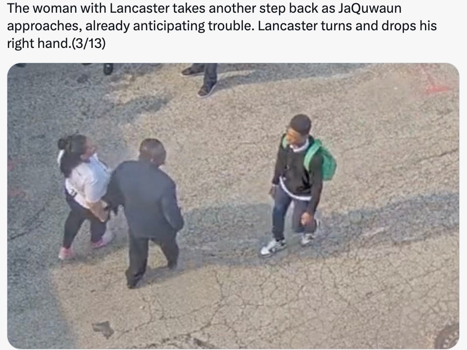 Clearly a threat to all present? The images — there is no sound on the recording — do not suggest that. Lancaster reportedly told investigators he heard JaQuwaun making “belligerent remarks aimed at the teacher.”