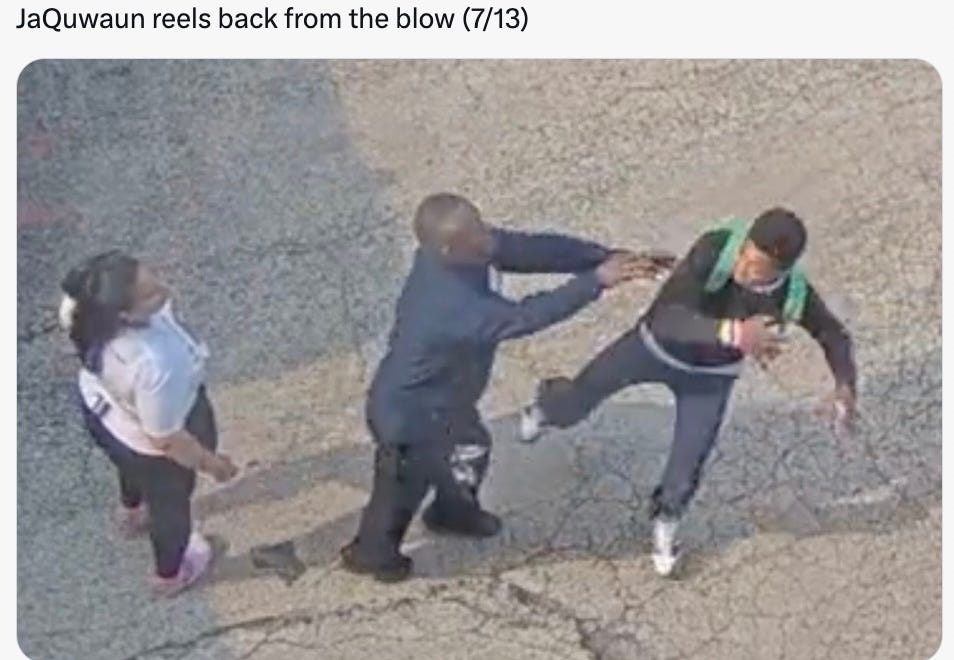 Just muttering to himself? The images — specifically the reactions of the bystanders — don’t suggest that, either. But JaQuwaun’s allegedly “belligerent remarks” would have to be awfully threatening — not merely insulting or disrespectful — to justify striking him, and his body language doesn’t suggest he was posing an actual threat to anyone.