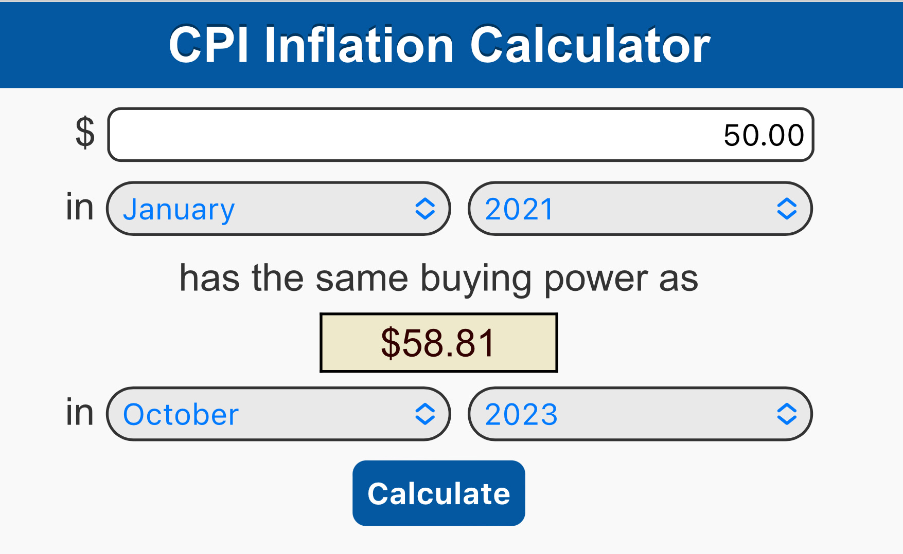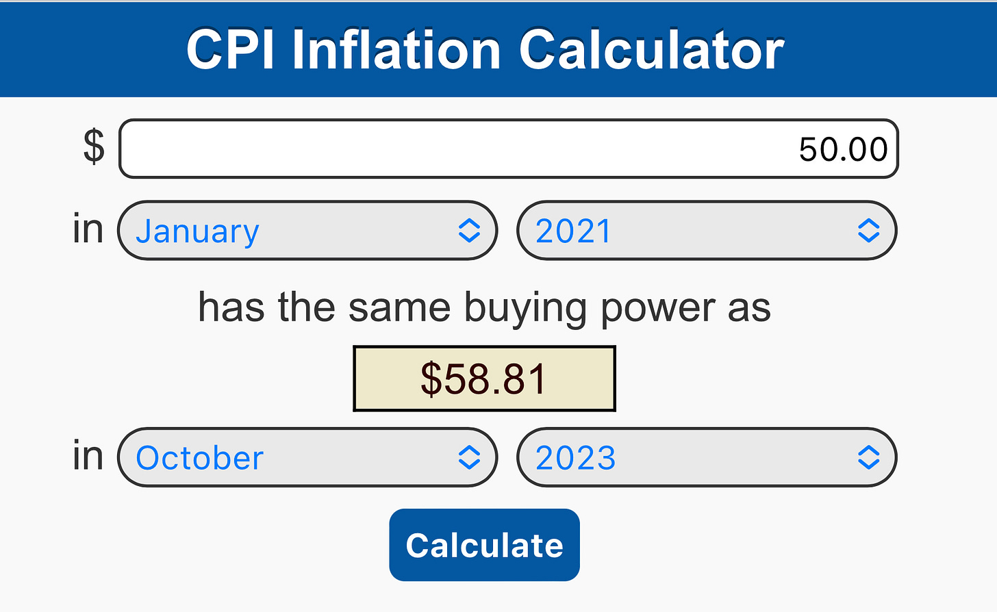 Yes, I am aware that the online inflation calculator image wrongly compared 2001 to 2023 rather than 2021 to 2023. The image has been updated in the online version. The correct image shows that $50 when the Picayune Plus began two years ago is now worth $58.81
