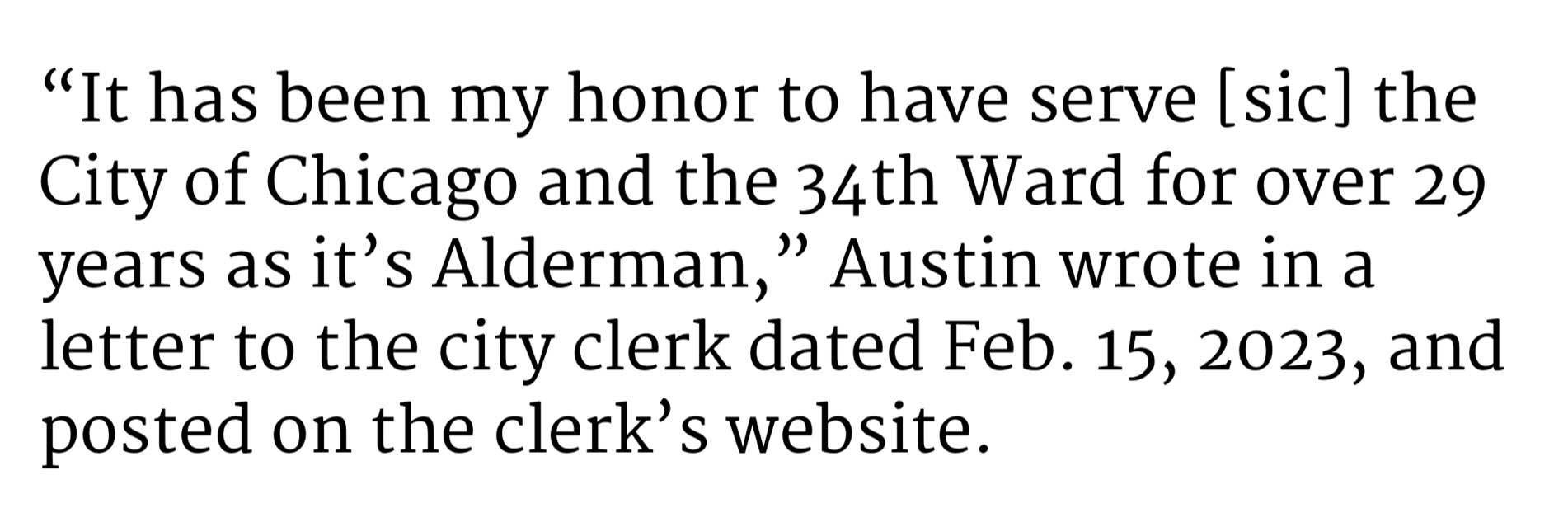 This appeared in Tuesday’s story in the Sun-Times about the resignation of Ald. Carrie Austin, 34th.