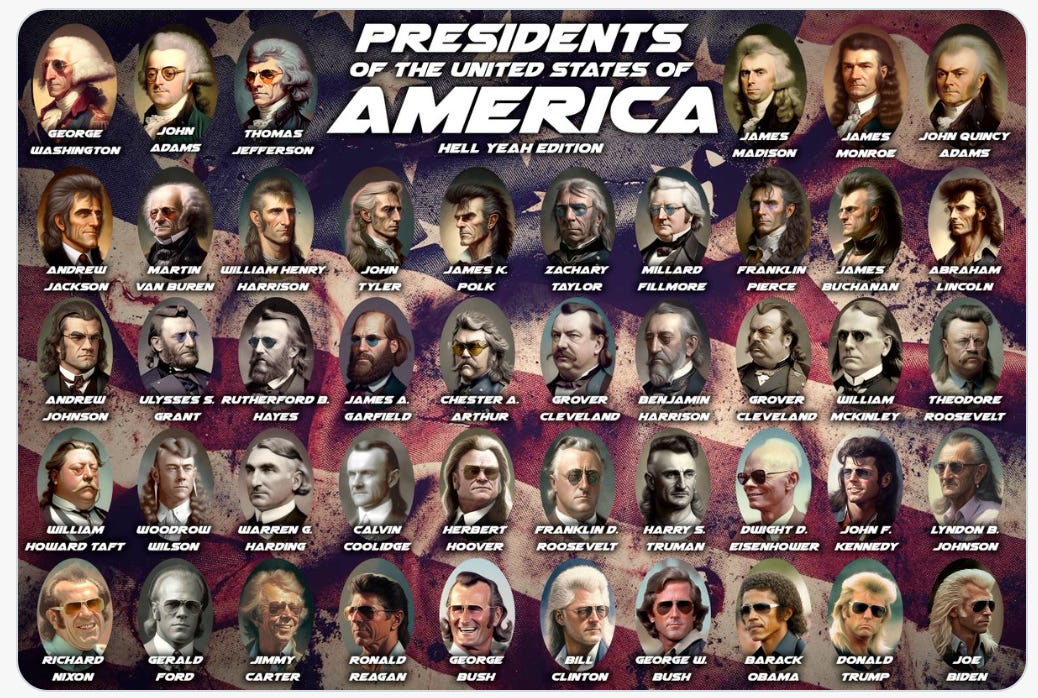 Last week, I featured the image of Joe Biden with a mullet. If you enjoyed that, you might enjoy the poster of all the U.S. presidents with mullets by Cam Harless, available for purchase here.