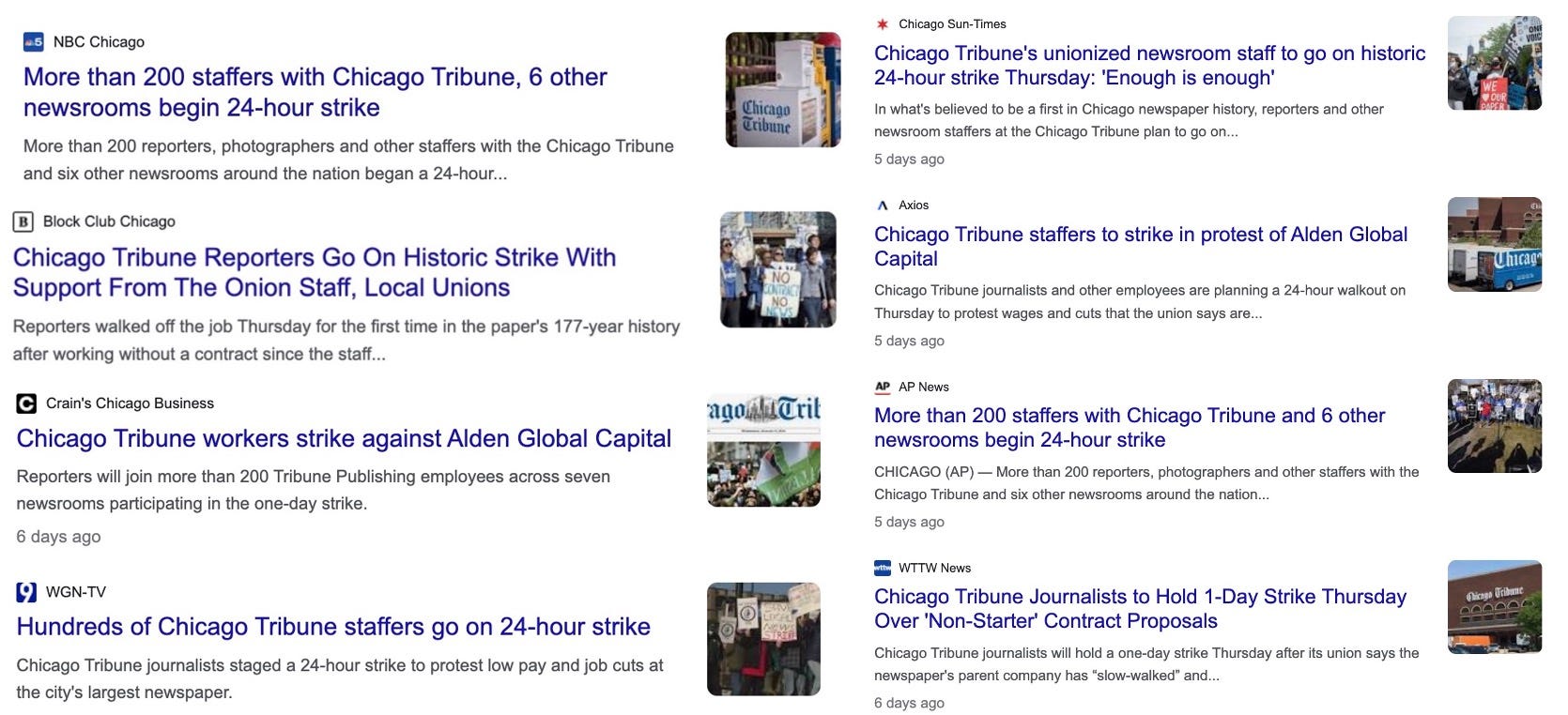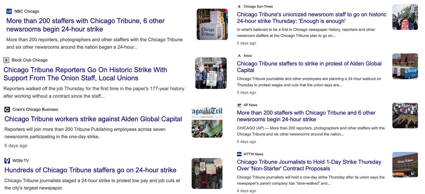 Below, via Google News, is a sampling of the coverage that local media afforded last Thursday’s one-day walkout by unionized members of the Chicago Tribune newsroom.