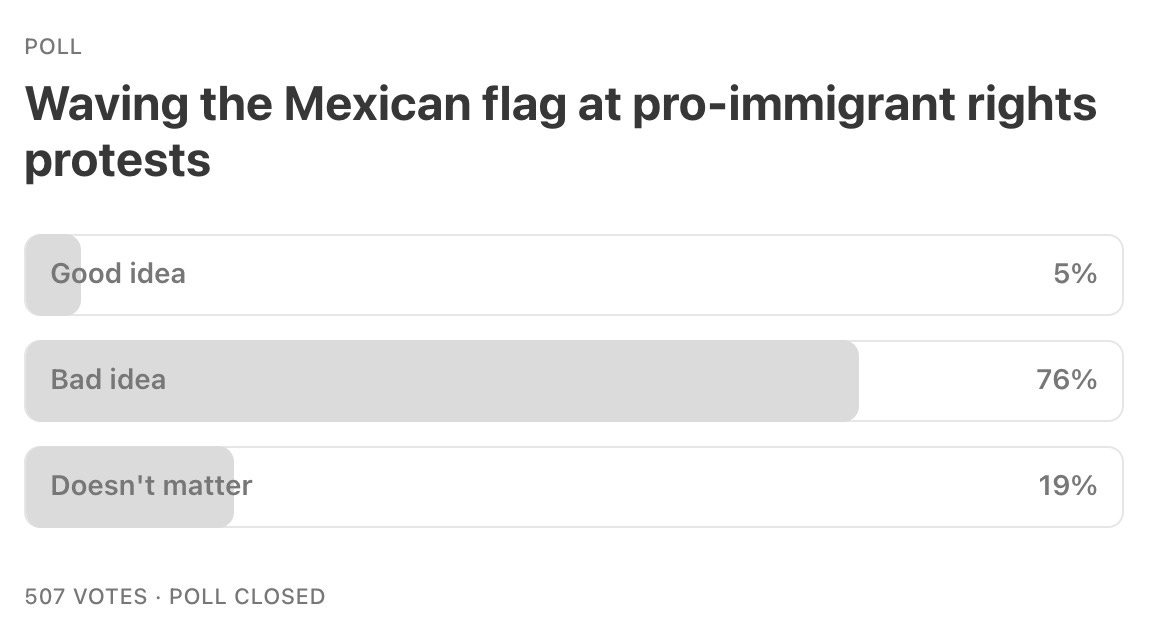 Lynne Allen Taylor — I try to be inclusive and progressive, but I find my reaction to seeing the flags of other countries waved at protests is like how a bull reacts to a red cape. Are you protesting to have your rights recognized under the U.S. Constitution and laws? Or are you letting me know about your Mexican or other heritage? If the former, leave the flag at home. If the latter, save it for another time.