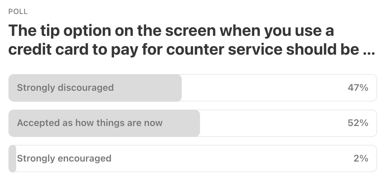 Steve T. — For those who are upset with all the iPad-turn tip requests, are you OK with the “tip amount” line on the pen and paper restaurant check?