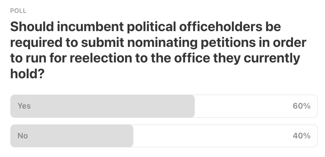 John Houck — Incumbents already have enough advantage just being the incumbent. No need to let them skip the petition process. That said, I do think it’s counterproductive to only allow a voter to sign one petition. It doesn’t hurt to have robust primaries, and allowing voters to sign multiple petitions might lead to better candidates participating instead of just the one who got those signatures first.