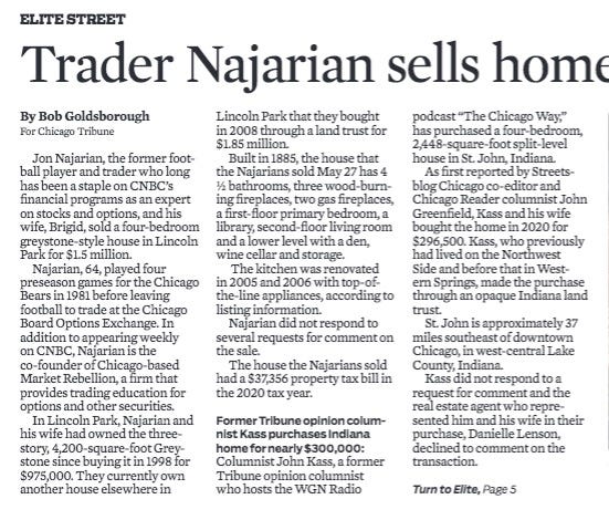 What I find most interesting about the Kass home-buying item is the timing. He wrote a column in May 2020 about his move "back to the City", but then - also in 2020 - he buys a house in NW Indiana? It appears (to me at least) as if he's making a big deal by very demonstratively "moving back to Chicago" (and, ostensibly, his roots), to burnish his Chicago bona fides. He then subsequently surreptitiously decamps to St. John, IN. He writes a friggin' column about his move to the City, but then we hear nary a peep from him about his move out. Why the move? Was he or his family the victim of a crime? Was there a family reason for the move? Was it pandemic related? We get bupkis. The fact that it took almost 2 years to acknowledge his departure is interesting.