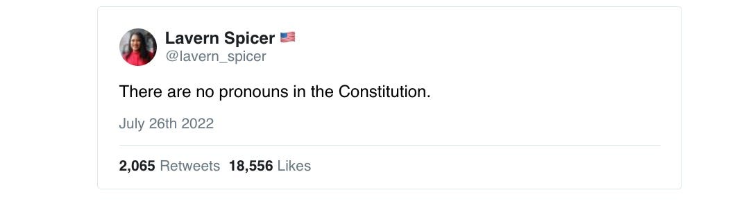 Spicer is running for the U.S. Congress as a Republican in Florida. She does not seem to know what a pronoun and/or she has never actually read the Constitution, which begins with a pronoun.