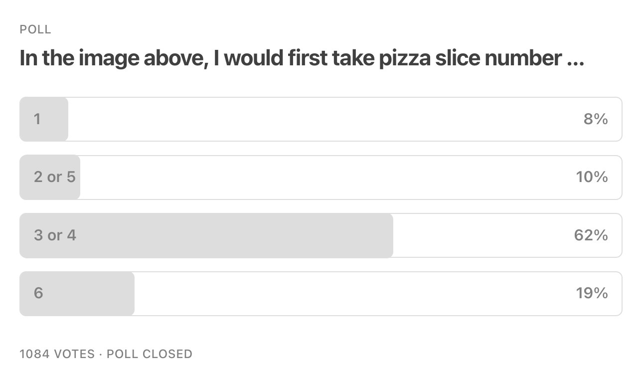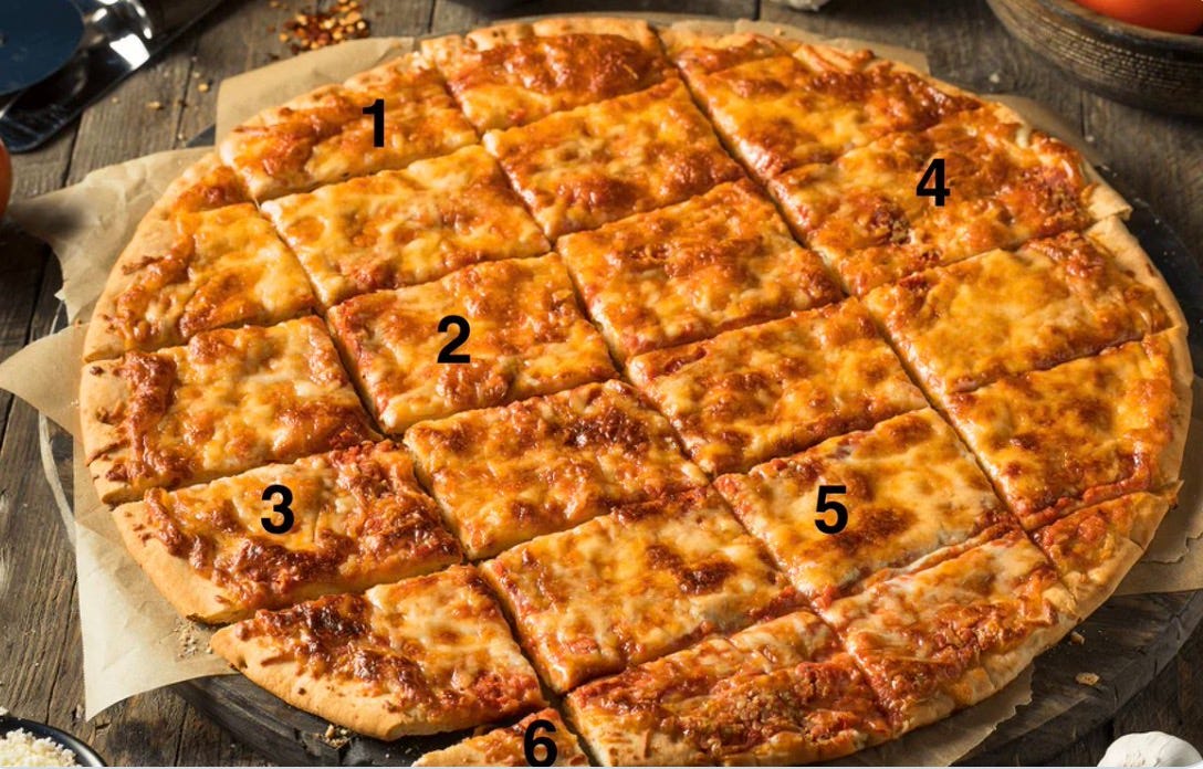 Objectively, the only reasonable piece to take from that pizza is #1. Jon picked 6, presumably to be gracious and take the smallest piece. However, taking 1 leaves edge pieces for others after you. Also there are some people who really like corner pieces and there are only four of those, so it is gracious to leave the corners. 3 and 4 should be ruled out because they go deeper toward the center. Given that you are taking the first slice, we can assume that this pizza is fresh out of the oven. The deep edge slices 3 and 4 are too hot to eat at their center facing edges, which is what you would do because you hold it at the outer edge crust.