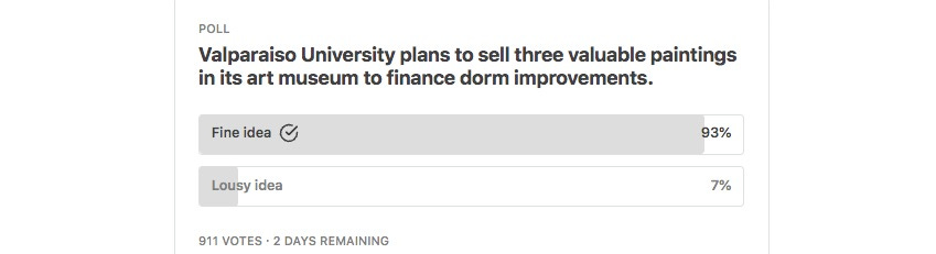 Jake H. — Regarding your support for the controversial decision by Valparaiso University to sell off three valuable art works from its campus art museum in order to fund dorm improvements: I am sympathetic with the museum-world ethos that art is only to be sold to buy other art, and not for operating expenses or anything else. It's often really easy to discount the value of artwork in the face of more immediate, more concrete concerns.