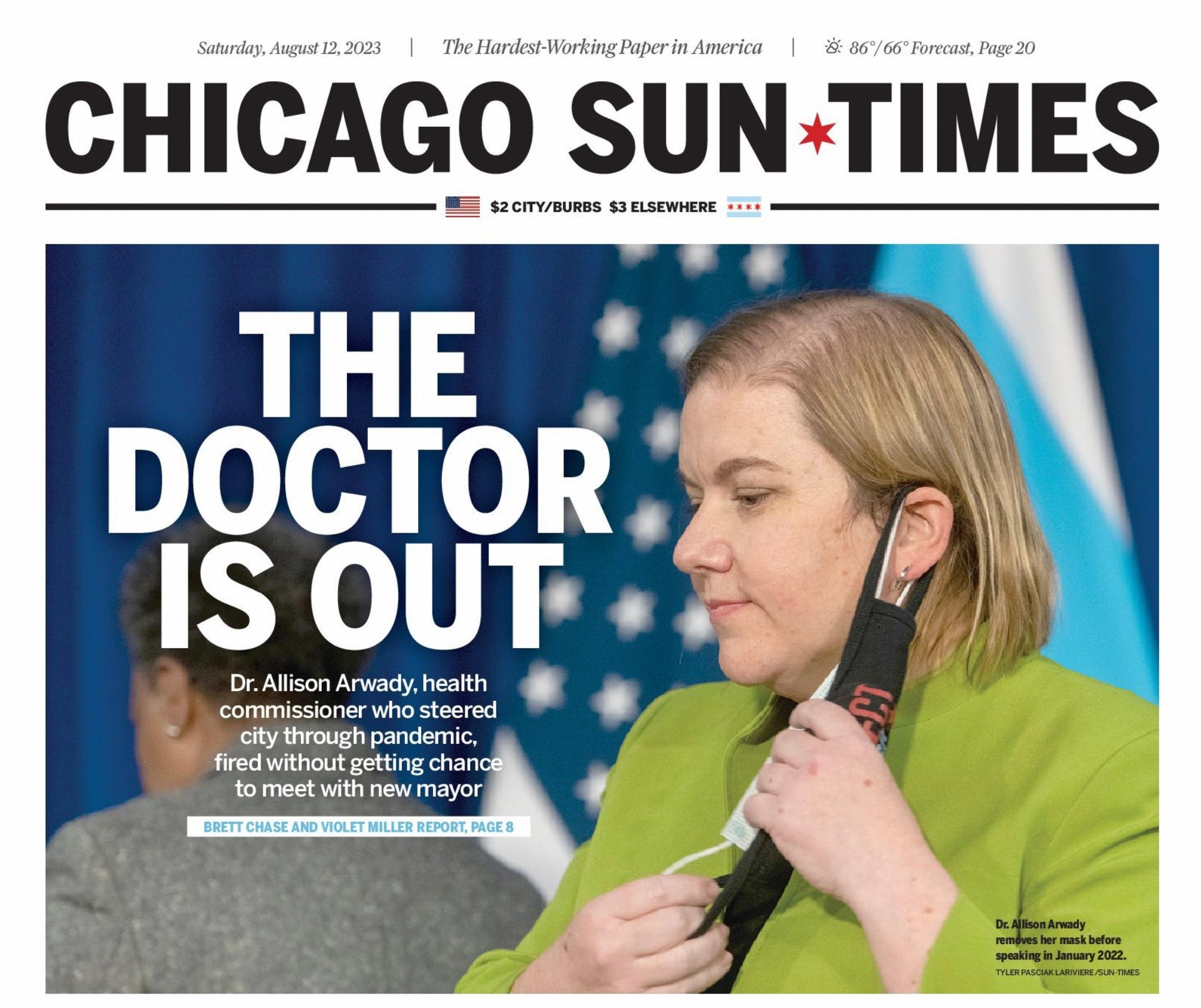 Credit the Sun-Times with a clever front-page headline in Saturday’s paper and the Tribune with a front-page headline that contextualized the outrage (and with using a more flattering photo of the ousted health commissioner).