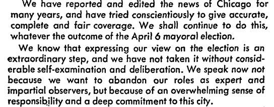 More than 50 years ago, scores of rank-and-file Chicago journalists defied tradition and openly challenged their own colleagues. After all the major papers endorsed Mayor Richard J. Daley for re-election over Richard Friedman, an independent Democrat challenging Daley as a Republican, the staffers published a rebuttal citing Daley’s “shameful” record.
