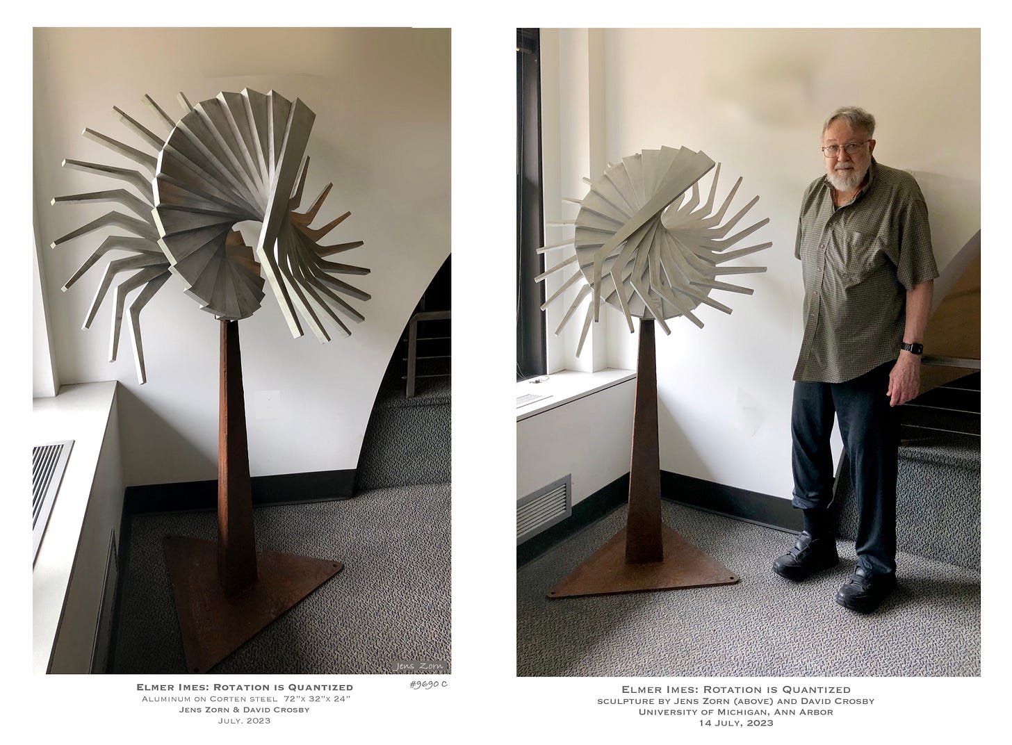 At 92, my father, Jens, a retired professor of physics at the University of Michigan, is still turning out amazing and beautiful sculptures based on scientific achievements. Here he is with his latest work, built with his friend and former student David Crosby and temporarily installed in the Dennison Colloquium Room as it awaits a permanent home.