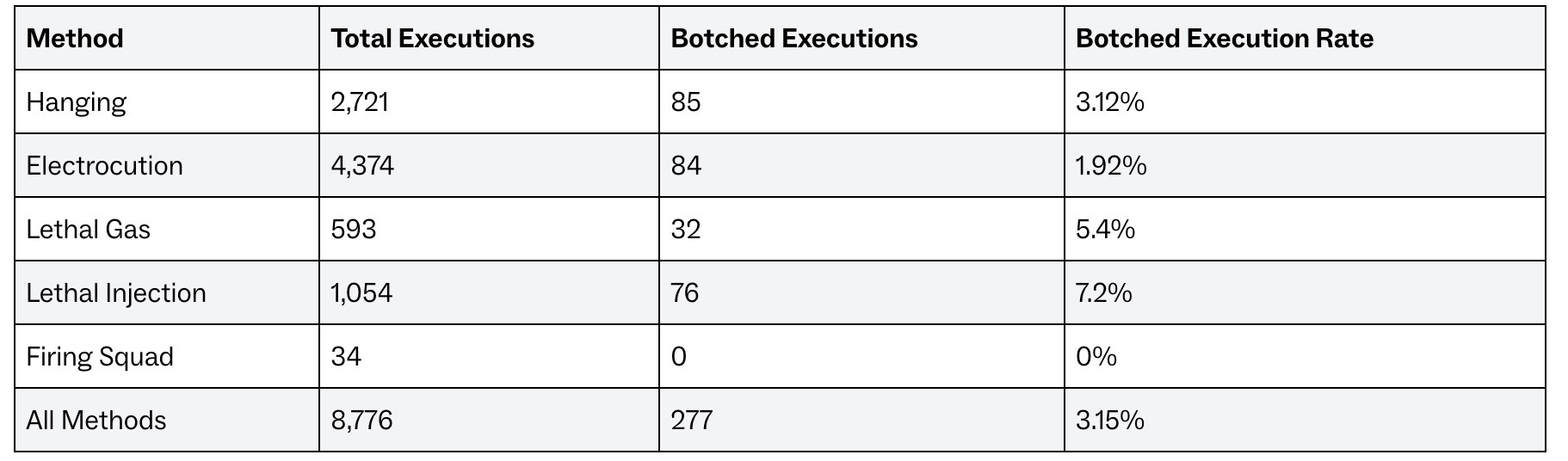 The site notes that the research from which these figures were generated did not take into account two botched firing-squad executions on record, both in Utah, one in 1951 and the other in 1879.