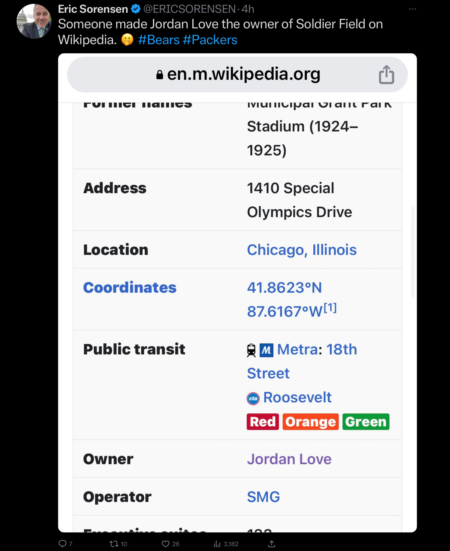 Wikipedia deleted the Jordan Love/Soldier Field goof fairly quickly. For those who have forgotten or don’t get it, here is the reference.