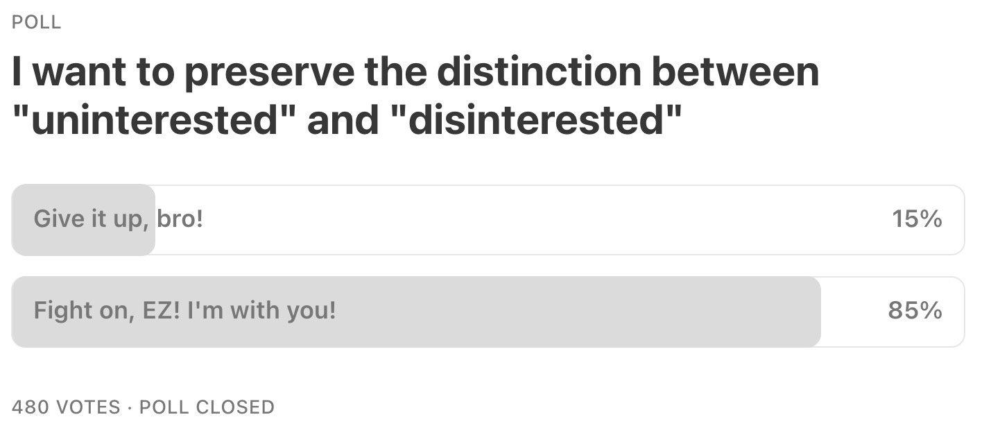 The distinction between the words “uninterested” and “disinterested” is important, yet they are used so interchangeably that I fear the battle to preserve the separation has been lost.