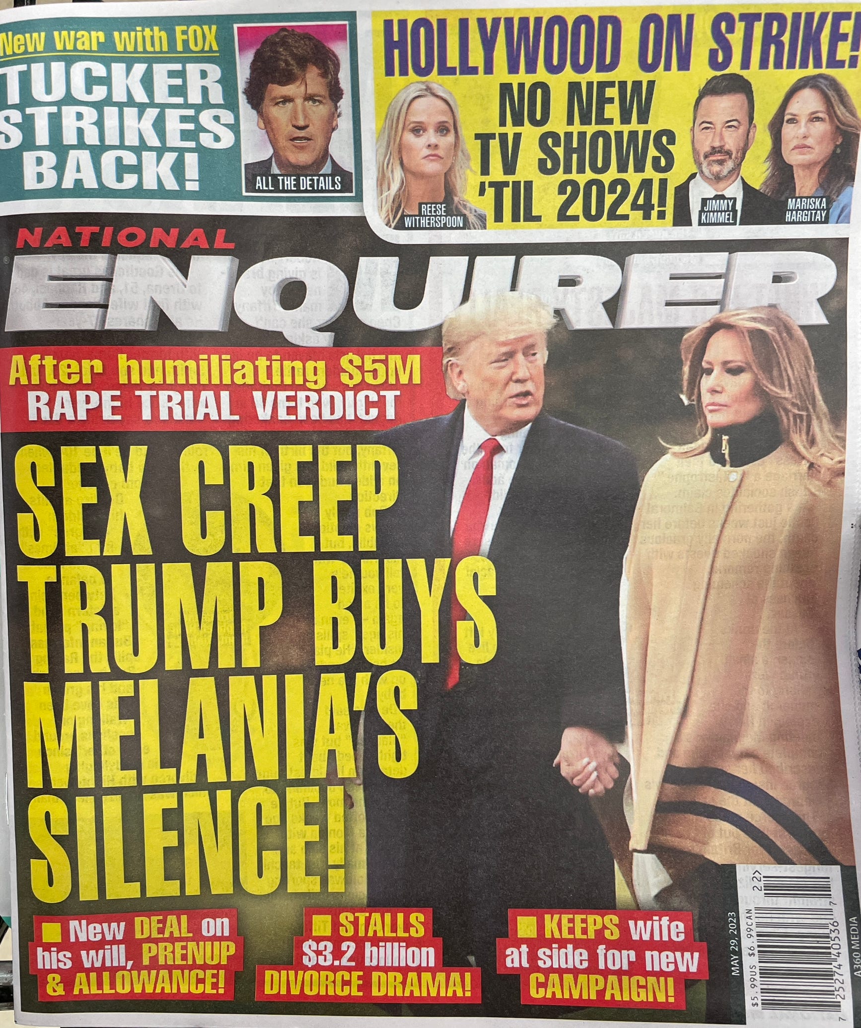 I don’t regularly look at the magazine racks when in a checkout line so I don’t know how recent this development is. My face is usually buried in my phone as I wait for the cashier (I wonder if the fact that everyone is always looking at their phones has dampened point-of-purchase sales for publications). But the cover image above marks an evolution from 2019 when I wrote a column arguing it had become immoral for merchants to sell the Enquirer: