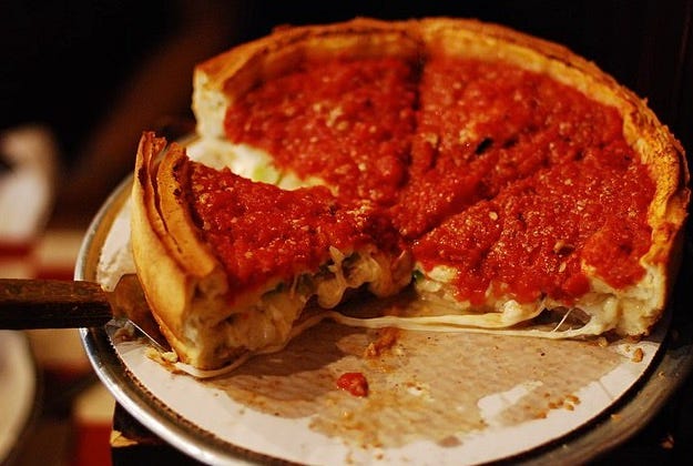 Eating a deep-dish pizza