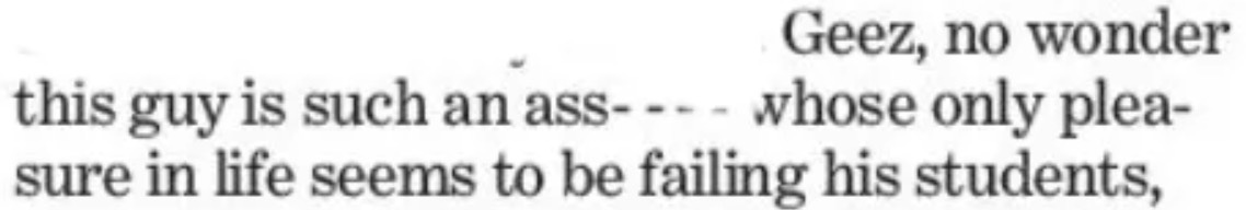 Also strange is that the writer wasn’t attempting to quote someone else in a delicate fashion. He (or his editor) simply punted on seeking a clean or clever synonym for asshole. “Ass——” causes you, the reader, to think “asshole,” which is very unlikely to send you into a tailspin.