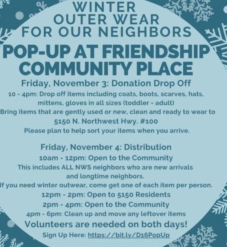 City of Chicago: “Information about how you can help Chicago’s newest arrivals.” Also see this (but note that distribution day, Nov. 4, is actually Saturday, not Friday):
