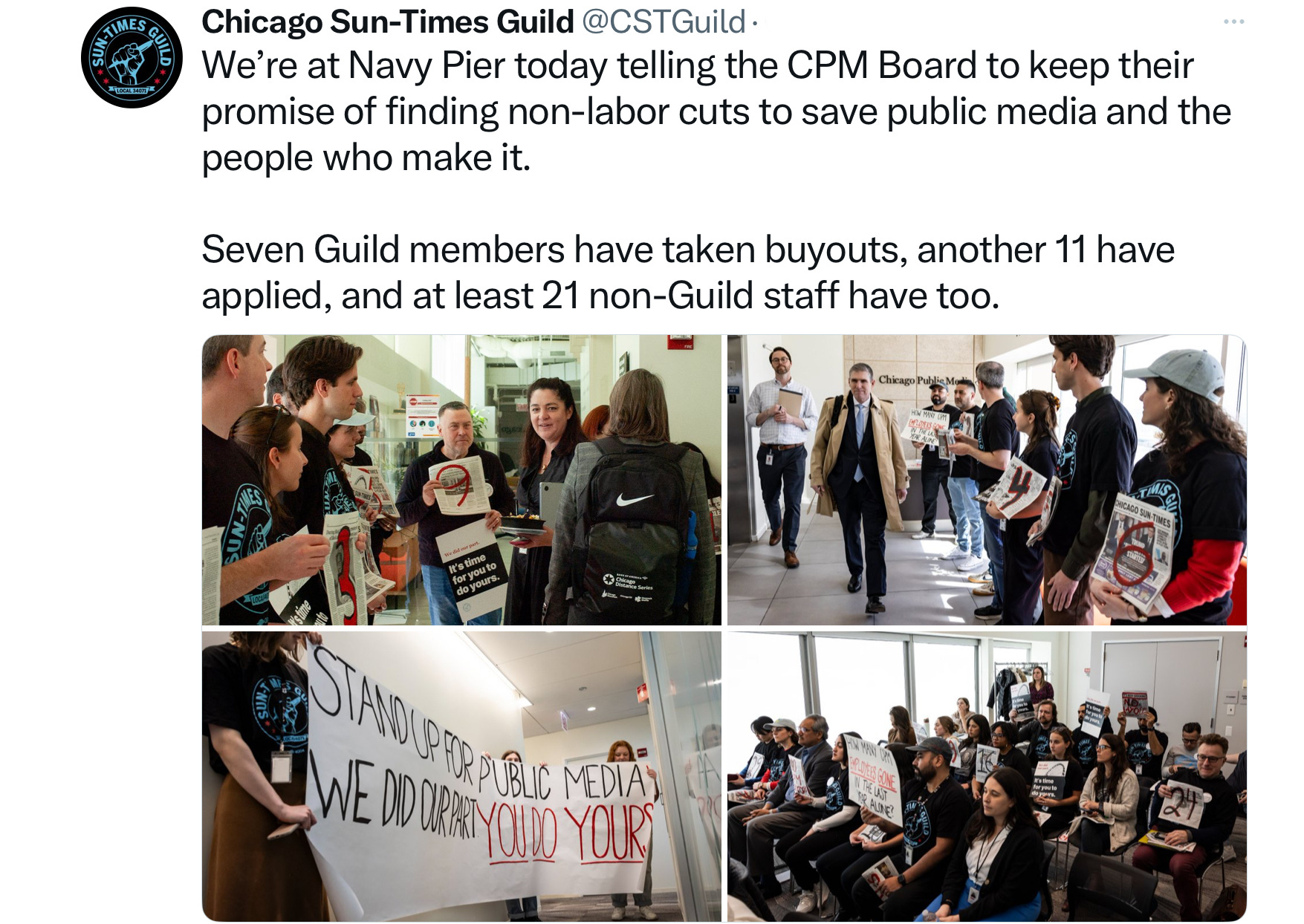 Cate Plys —So Chicago Public Media needs to close a $12 million annual operating deficit at the Sun-Times. CPM execs have spent their entire professional lives watching newspapers cut staff and ruin their product. Admittedly, newspapers (and news radio) lose readers and listeners anyway due to TV/cable/streaming and to social media, but destroying the product is the surest way to drive away the audience that has stuck around. Yet, CPM thinks the way to save money at the Sun-Times is to shed some of its most experienced people, including recognizable and admired personalities such as sports columnist Rick Morrissey. It's clearly not a winning business strategy. .