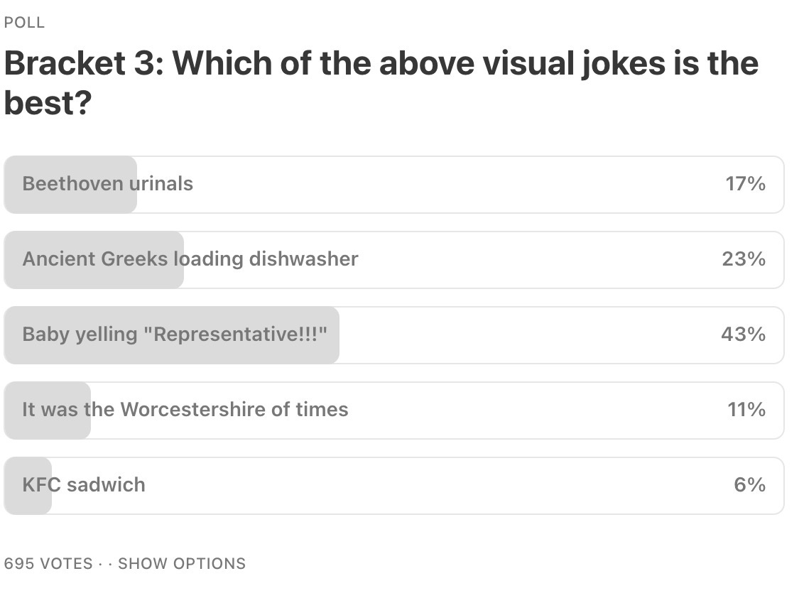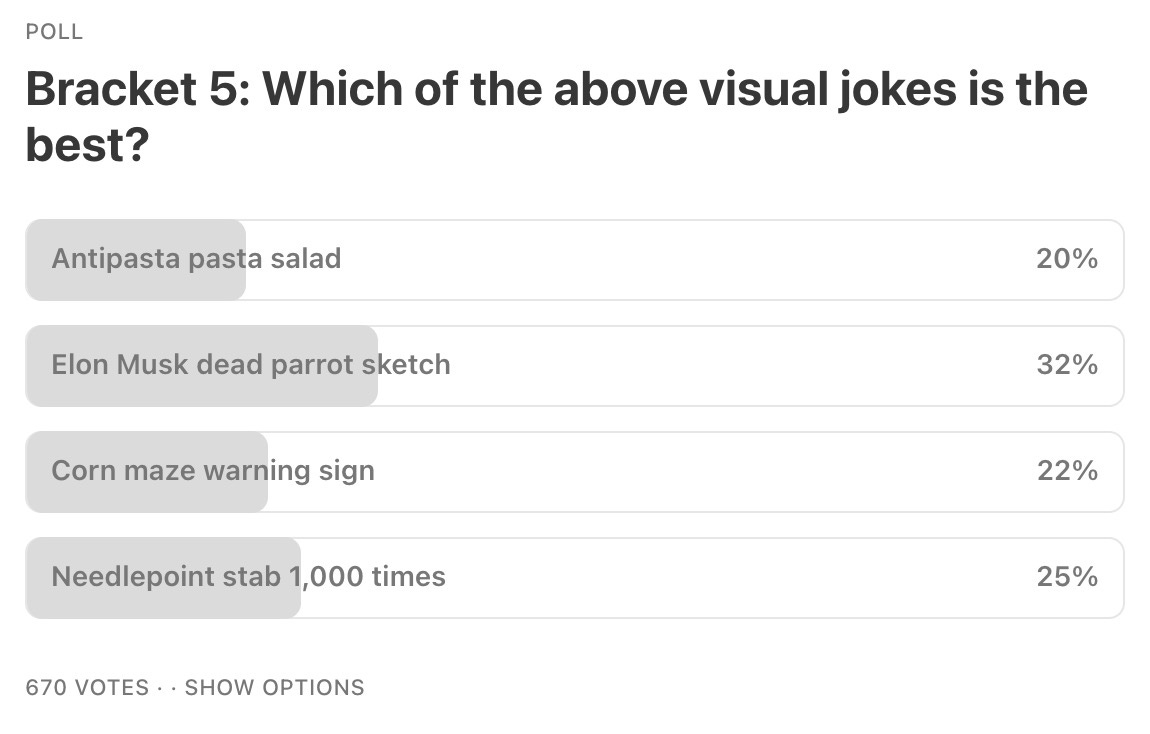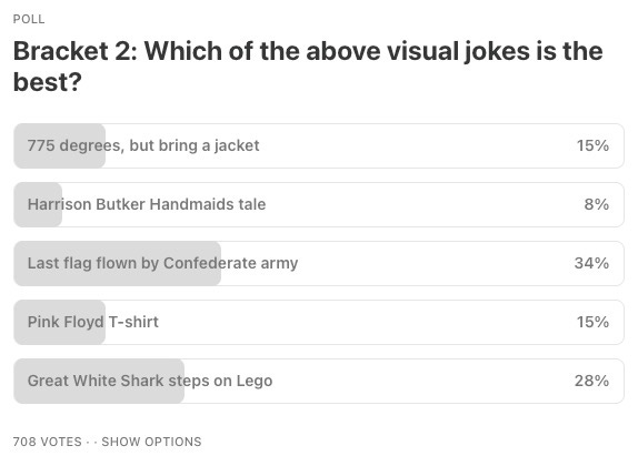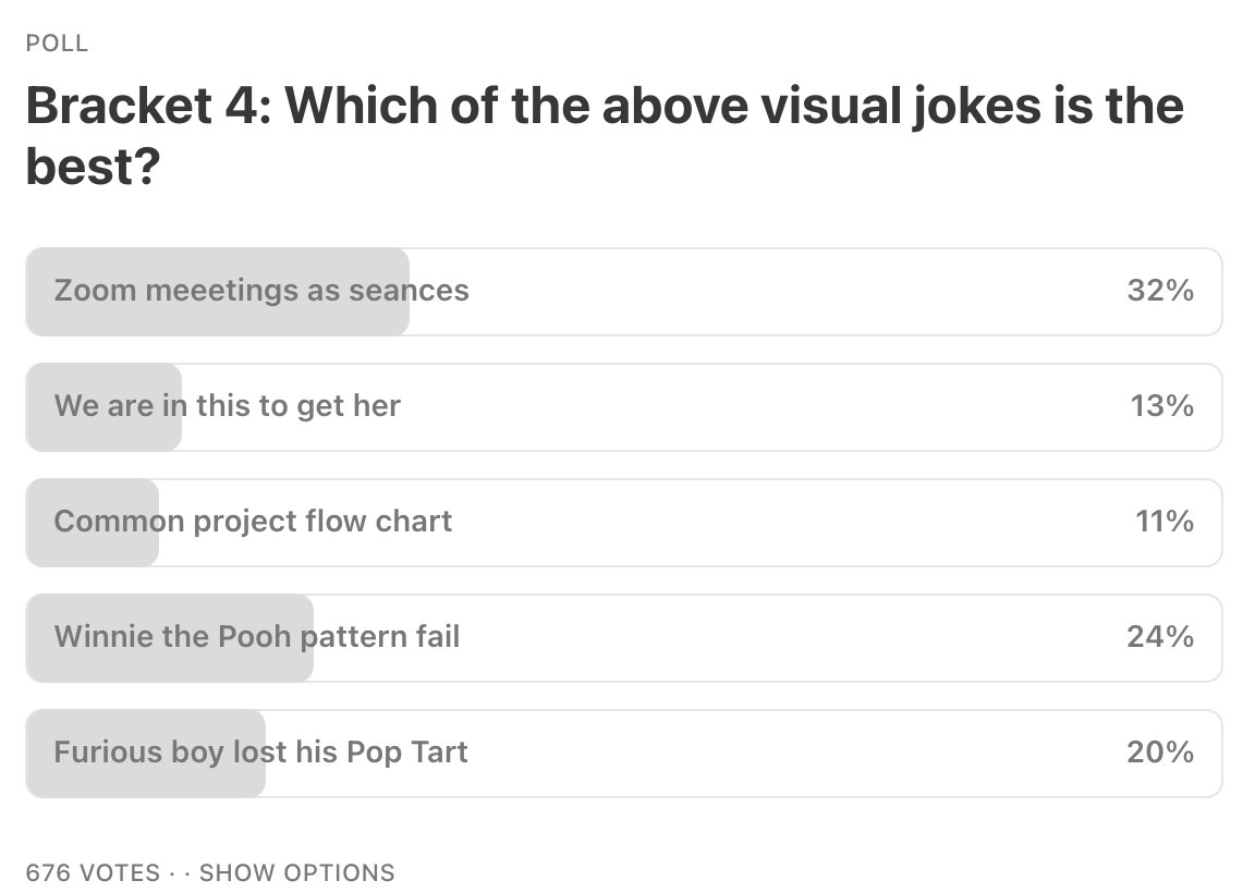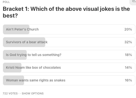The madness continues! Take your mind off the real news with both of our jokes tournaments