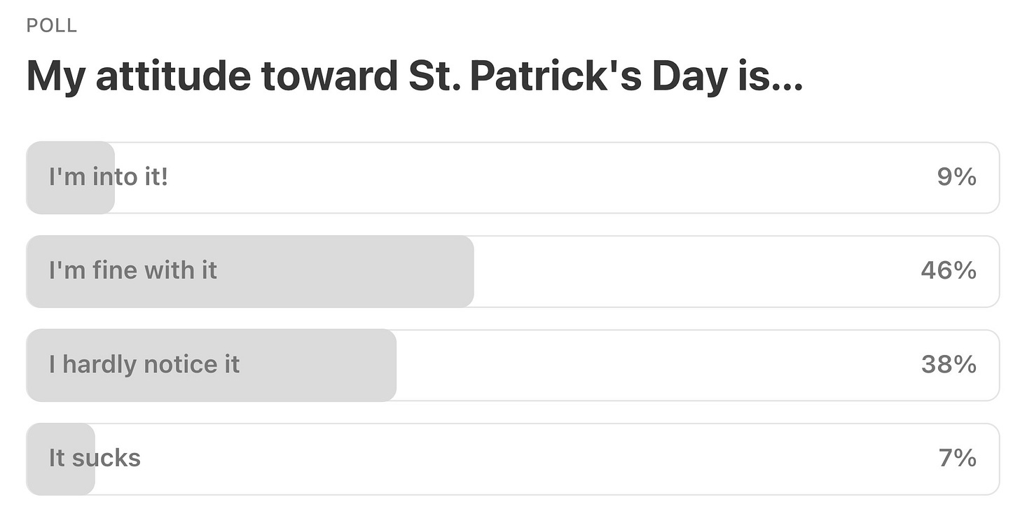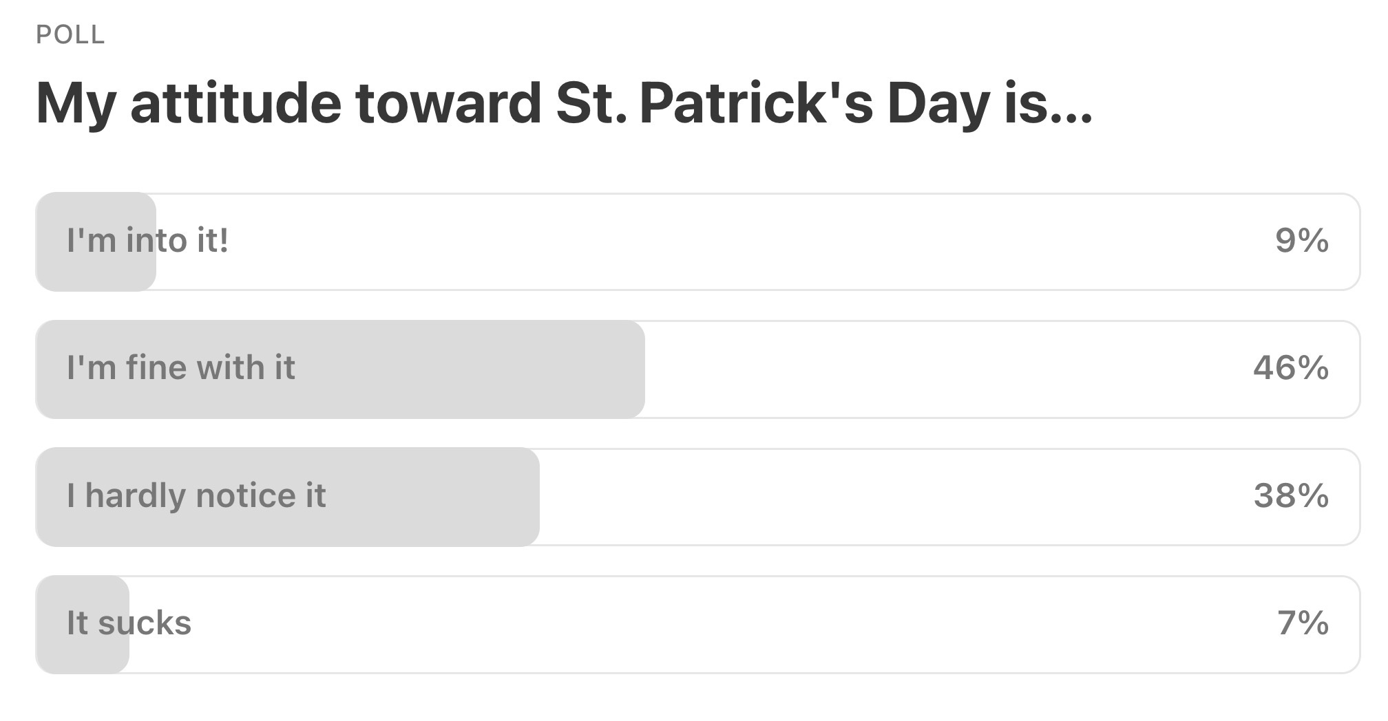 Reader L. Meyer’s opinion that St. Patrick’s Day sucks did in fact prove quite unpopular: