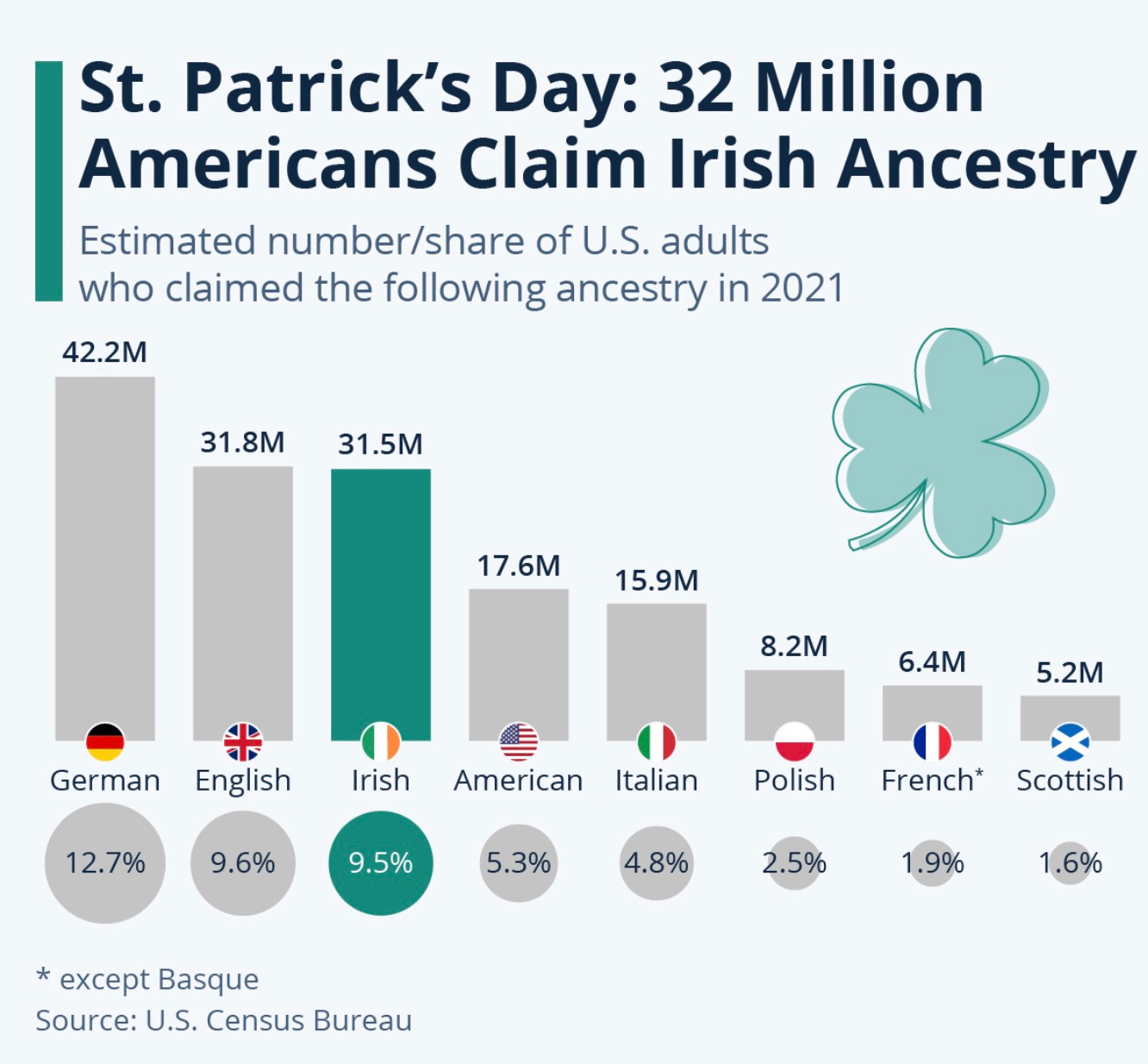 Nationally, 9.5% of the population claims Irish ancestry compared to 12.7% German, 4.8% Italian and 2.5% Polish. And yes, there are observances of Polish, German and Italian Pride (quick, can you tell me what the month of the Steuben Parade honoring German heritage?*) but St. Patrick’s Day dwarfs them all.