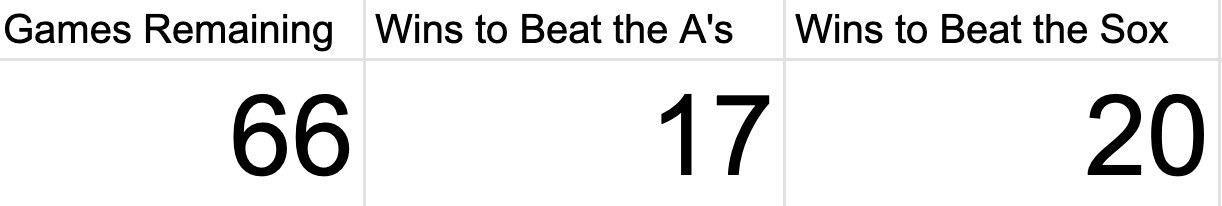 The Rockies, now with a winning percentage of .229, need to play .303 ball down the stretch to beat the Sox and .258 ball to beat the A’s.