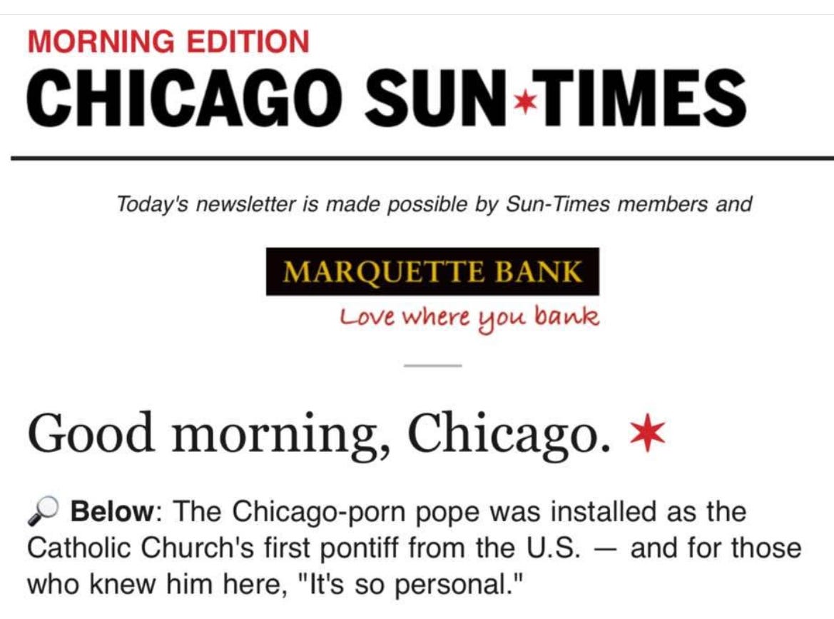 It took just 37 minutes for the Sun-Times to issue a corrected version of its “Morning Edition” email newsletter — he’s the Chicago-born pope — but the idea of a Chicago-porn pope delighted my friends on Facebook: