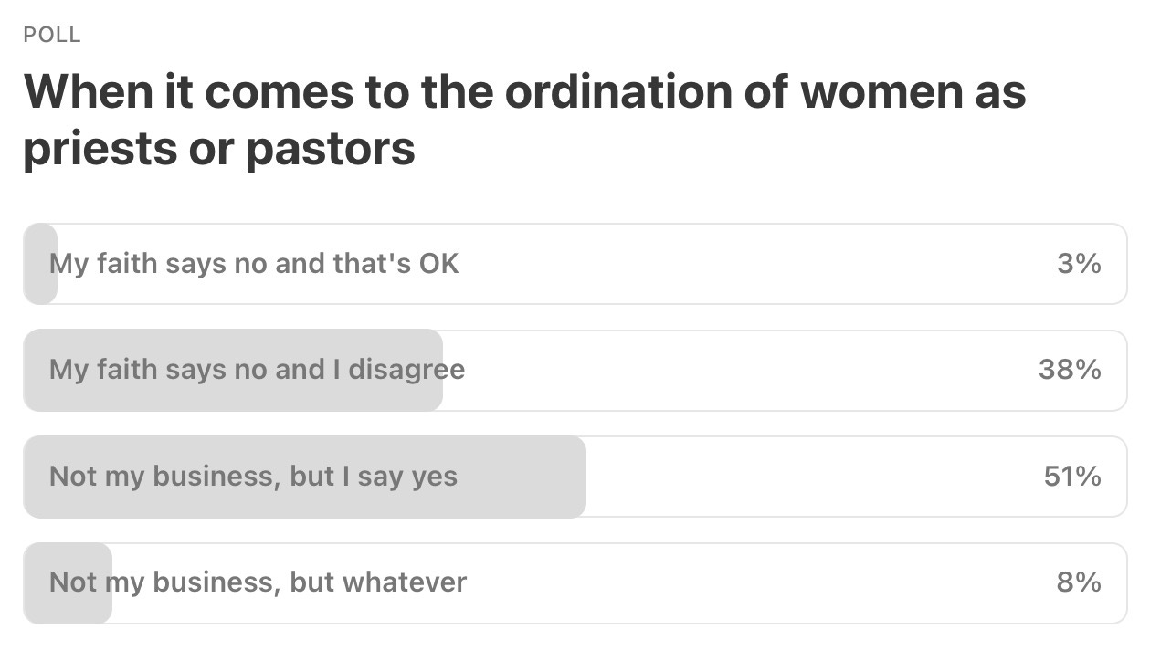 Marc Martinez — I’m surprised at the number of “not my business, but I say yes” to female ordination responses. Why nitpick about any particular belief of a religious sect that one rejects? Opinions of non-believers regarding roles, or dress, or dietary rules, or whatever seem like itemized rejection of beliefs that have already been rejected in whole. I am indifferent to the way any sect practices its rites or manages the evolution of those practices. I have no problem with criticizing human rights abuses in religions, cultures, and judicial systems. Stoning adulterers and executing or imprisoning heretics are also practices which we do not hesitate to condemn.