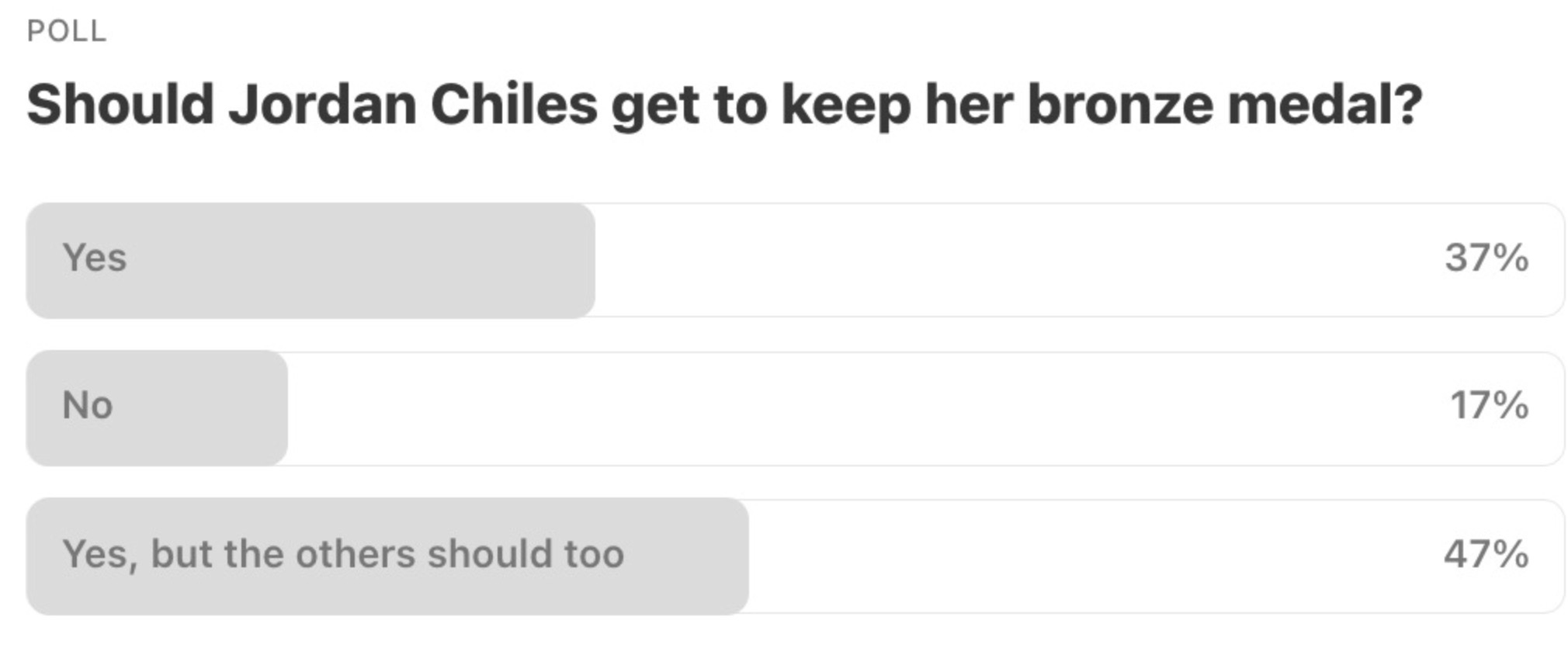 Meanwhile, I have to join the vast majority of you readers in disagreeing with your take, “Jordan Chiles deserves a bronze medal but shouldn’t get one. Fight me” You wrote that "even stupid and arbitrary rules have to be enforced until they are officially changed." There are many laws around the country that are just plain silly and are not enforced, like one law on the books in Vermont where a woman needs written permission from her husband in order to obtain dentures. Should this law be enforced?