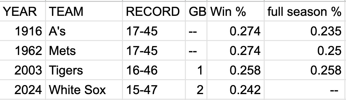 As long as the race remains close — which it may not — I will offer you comparison standings of the 2024 White Sox with the 2003 Detroit Tigers and the 1962 New York Mets, teams that have defined futility for more than 80 years, and the 1916 Philadelphia Athletics, the worst team in baseball’s modern era (20th century on).
