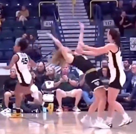 True enough. She’s known for trash talking, and this video clip is making the rounds and shows Clark during a college game against Purdue University Fort Wayne shoving an opposing player to the floor for no obvious reason: