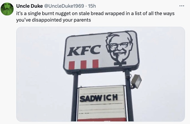 In Tuesday’s paid-subscriber editions, I present my favorite tweets that rely on visual humor. Subscribers vote for their favorite, and I post the winner here every Thursday.