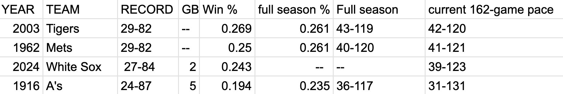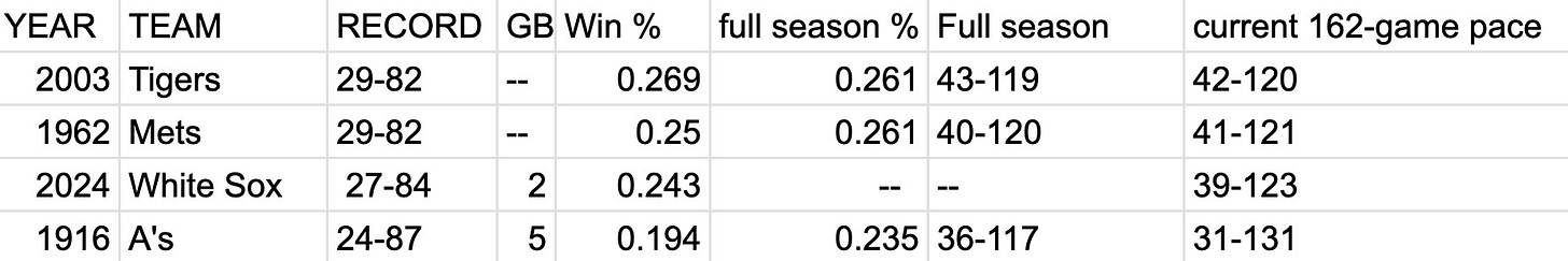 As long as the race remains close, I will offer you comparison standings of the 2024 White Sox with the 2003 Detroit Tigers and the 1962 New York Mets, teams that have defined futility for more than 80 years, and a comparison to the 1916 Philadelphia Athletics, the worst team in baseball’s modern era (20th century on).