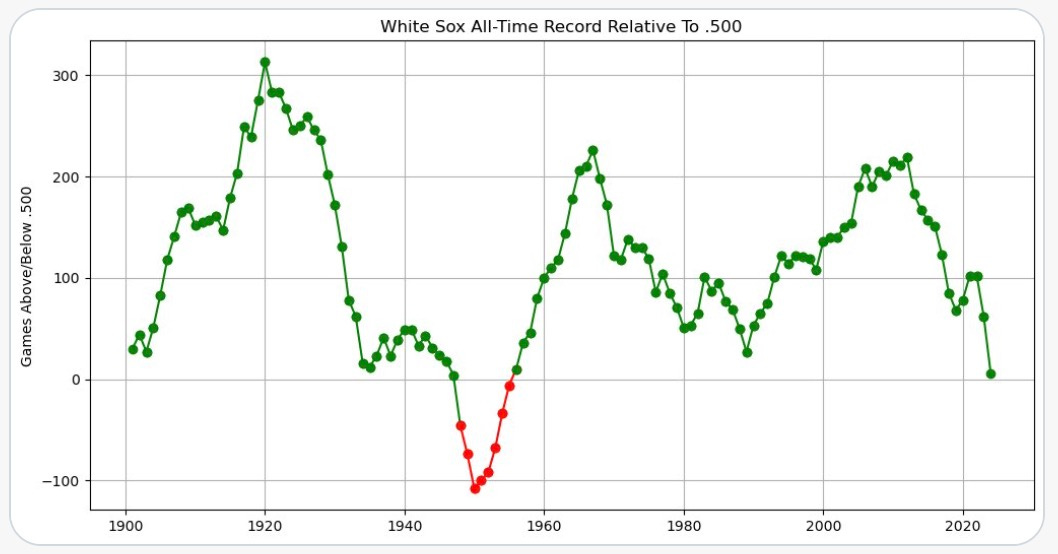 A fellow online who goes by @WhiteSox_Jack posted this graphic of the Sox all-time record relative to the .500 mark. I didn’t check his research, but according to him, the team is now 9,580-9,575 and about to dip below the break-even line for the first time in some 70 years.