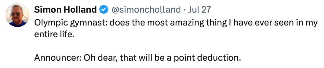 All day Tuesday, for example, I did my best to try to avoid learning the results of the women’s team gymnastics final that would play out on tape delay that night, but in the middle of the afternoon when I clicked on a link to an Associated Press story about Kamala Harris, I was hit with a “Breaking News!” banner telling me the U.S. women had won gold.