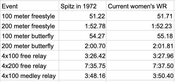 Along those same lines, I noted that the top female swimmers of today are now very very close to the gold medal, record-setting performances of the legendary Mark Spitz 52 years ago in the 1972 Summer Olympics: