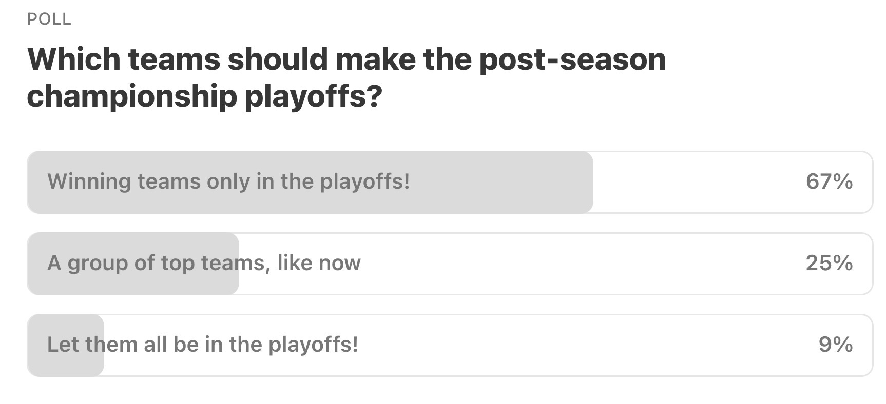Mark K. — I'm for a set number of teams participating in the playoffs, even if it includes teams with losing records. It sets the number of playoff games at a known number instead of reducing it. It motivates more teams to compete toward the end of a season when they may otherwise be mathematically eliminated. It allows for a chance of a huge upset instead of letting a good team off with a bye. It gives teams that were possibly hurt by a strong schedule or injuries early in the season still have a chance at the title. Rooting for an underdog is more fun, at least for me. Generally, I would want the playoff teams to be the best of that particular season, not necessarily objectively "good".