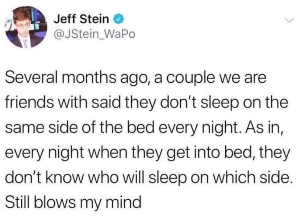 I’m curious if any couples out there switch sides at random, so I’m asking: