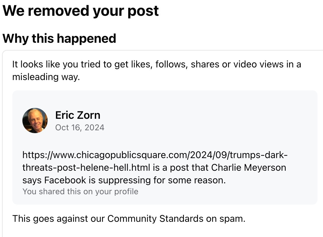 ■ In another sign that Facebook really, really wants Chicago Public Square to stop sending readers its way, the company’s repeatedly removed posts sharing the Sept. 30 edition, which among other things featured news of The New York Times’ presidential endorsement for Kamala Harris. Facebook says, “It looks like you tried to get likes, follows, shares or video views in a misleading way.” And/or: “Spam.” As with previous rounds of censorship, Facebook parent Meta provides no way to offer a personalized defense and no way to reach a human for answers.