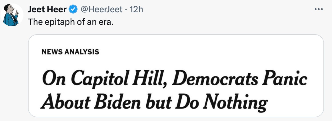 So in summary: Biden refused to say he’d take a cognitive test, refused to say he would consider stepping down if key allies asked him to, said the polls are fake news, and that he wouldn’t fret if he lost as long as he tried his best. This is all Trumpian bullshit. Just madness. — Tyler Austin Harper