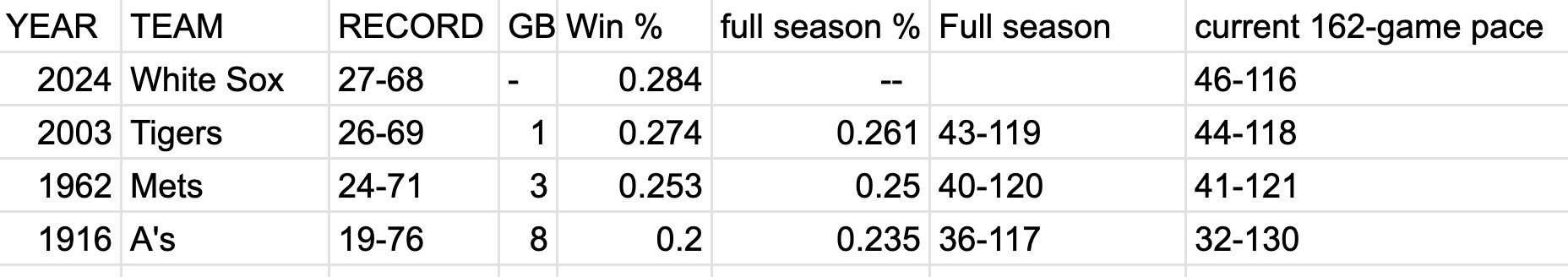 As long as the race remains close — which it may not — I will offer you comparison standings of the 2024 White Sox with the 2003 Detroit Tigers and the 1962 New York Mets, teams that have defined futility for more than 80 years, and the 1916 Philadelphia Athletics, the worst team in baseball’s modern era (20th century on).