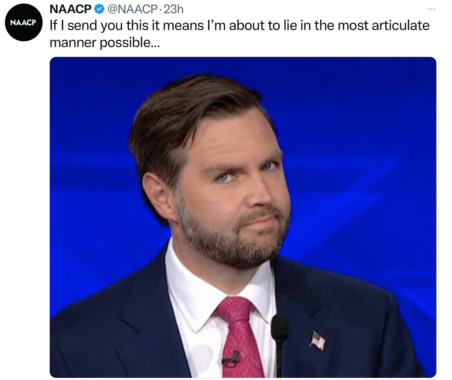 JD Vance gave an astonishingly impressive (debate) performance that was all wrapped up in the aura of a winner. With those piercing eyes and that perfectly coiffed hair, his FM-DJ-meets-Fox-News voice, and his absolute refusal to get riled about anything, even if it was one of his pet ideologies (like the evils of immigration), he worked the debate stage with remarkable panache. He had confidence; he had calm; he had a Mona Lisa smile that allowed him to stay above the fray. And, to my surprise, he had a touch of what Ronald Reagan did — the ability to make all his statements sound like a form of assurance. That was true even when he was selling pure malarkey. He argued that Donald Trump … was the savior of the Affordable Care Act! That the scuttling of the Iran nuclear deal was somehow not Trump’s doing, and that the Republican policy on women’s reproductive rights is all about generous, open-minded ideas of helping people find progressive ways to create families. He dodged questions he didn’t like by going off on tangents he never returned from. And he kept dipping into two grand canards that he inflated to the level of mythology. The first was that Kamala Harris is to blame for everything under the sun you don’t like. … But his other epic lie, and this was the insidious one, was to simply wipe away reality and treat Donald Trump’s presidency as if it were a lost utopia of rising wages and world peace and low inflation and — what about those corporate tax cuts? Oh yes! — trickle-down prosperity. — Owen Gleiberman, Variety