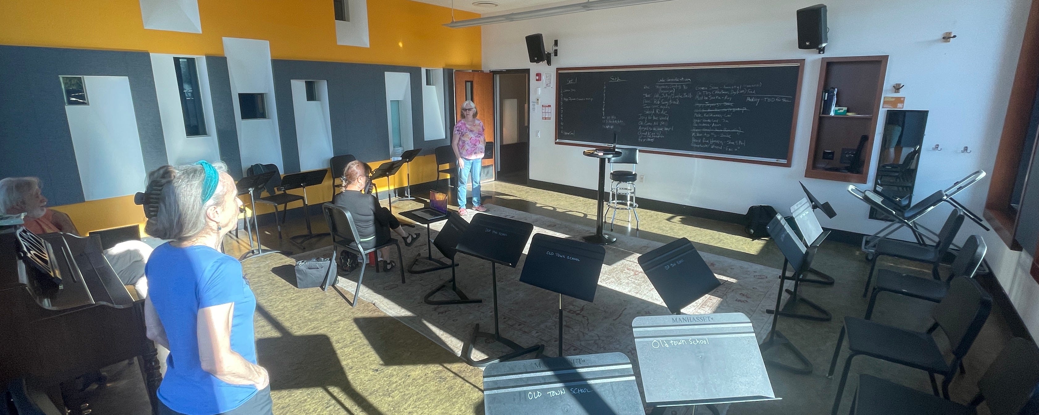 As is our custom, the first meeting — Monday afternoon — was a discussion session in which just a few of us got together in an Old Town School classroom to audition a few songs and begin sketching out possible set lists on the chalkboard.